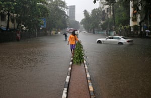 A girl walks on a pavement in a waterlogged street as the rain falls in Mumbai.