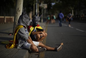 Two men wearing donkey masks and wrapped in pro-independence flags rest during a protest. Thousands gathered at the gates of Catalonia’s judiciary body in Barcelona to demand the release of a dozen officials arrested in connection with a vote on independence that Spanish authorities are challenging as illegal.