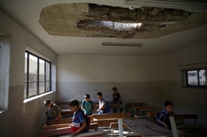 Students walk in a damaged classroom on the first day of school in the rebel-held neighbourhood of Douma.