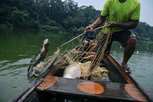 Fishermen pull up a crocodile which was caught in their net as they fished for arapaima.