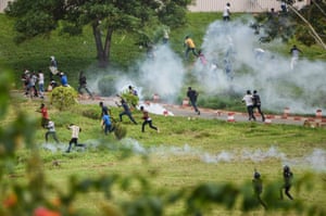 Police officers disperse protesting students with teargas during a demonstration against the rising costs of education at the Félix Houphouët Boigny University.