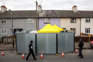 Police officers stand guard by a property being searched in connection with the alleged terror attack on Parsons Green station in London. An 18-year-old Iraqi orphan appeared in court this week accused of planting the bomb that half-exploded on a rush-hour London tube train, injuring 30 people.