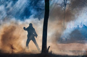 A protester is silhouetted during clashes with riot police at a demonstration against the French government’s labour reforms.