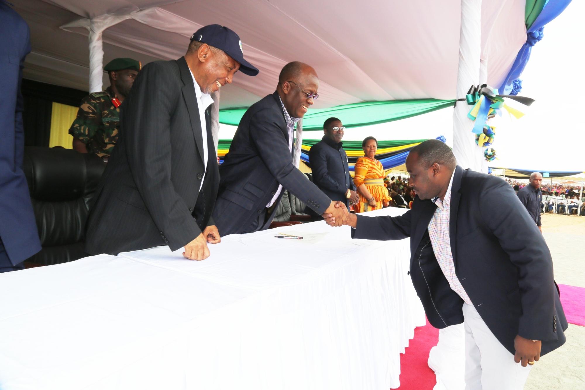 Rais wa jamhuri ya Muungano wa Tanzania Dkt. John Pombe Magufuli akipeana mikono na Mbunge wa Simanjiro Mhe. James Ole Milya kwenye sherehe ya kuzindua barabara ya lami ya kilomita 26 kutoka Uwanja wa Ndege wa kimataifa wa kilimanjaro (KIA) katika mkoa wa Kilimanjaro hadi Mererani mkoani Manyara leo Septemba 20, 2017.