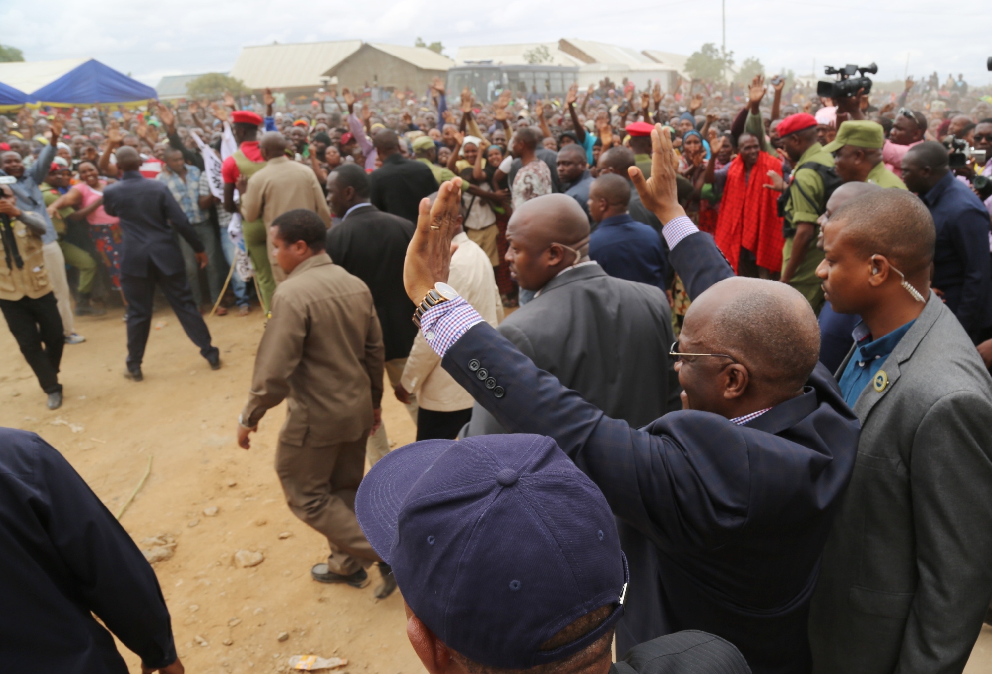 Rais wa jamhuri ya Muungano wa Tanzania Dkt. John Pombe Magufuli akipungia maelfu ya wananchi alipowasili Mererani kuzindua barabara ya lami ya kilomita 26 kutoka Uwanja wa Ndege wa kimataifa wa kilimanjaro (KIA) katika mkoa wa Kilimanjaro hadi Mererani mkoani Manyara leo Septemba 20, 2017